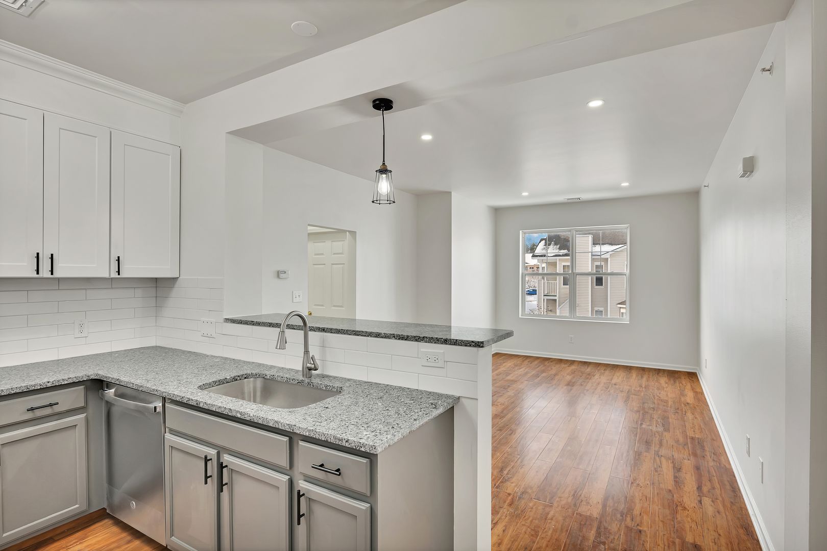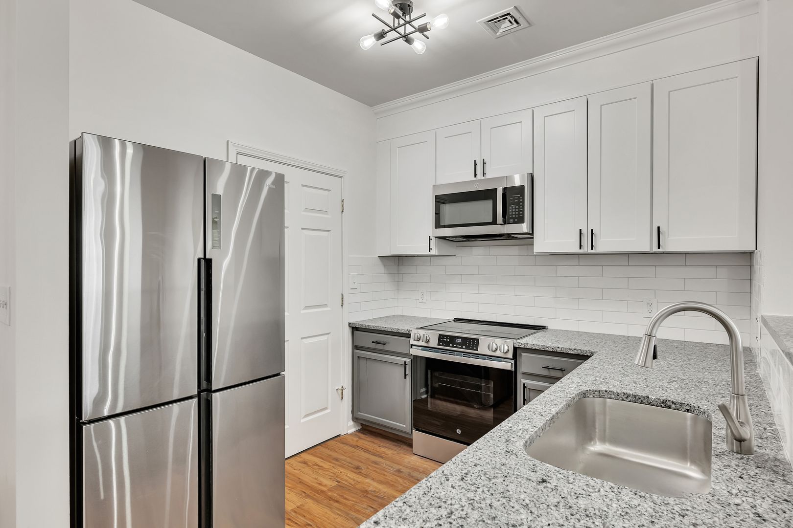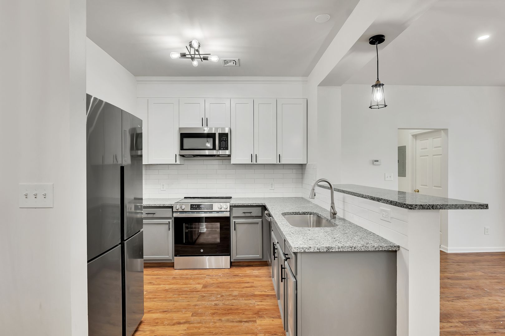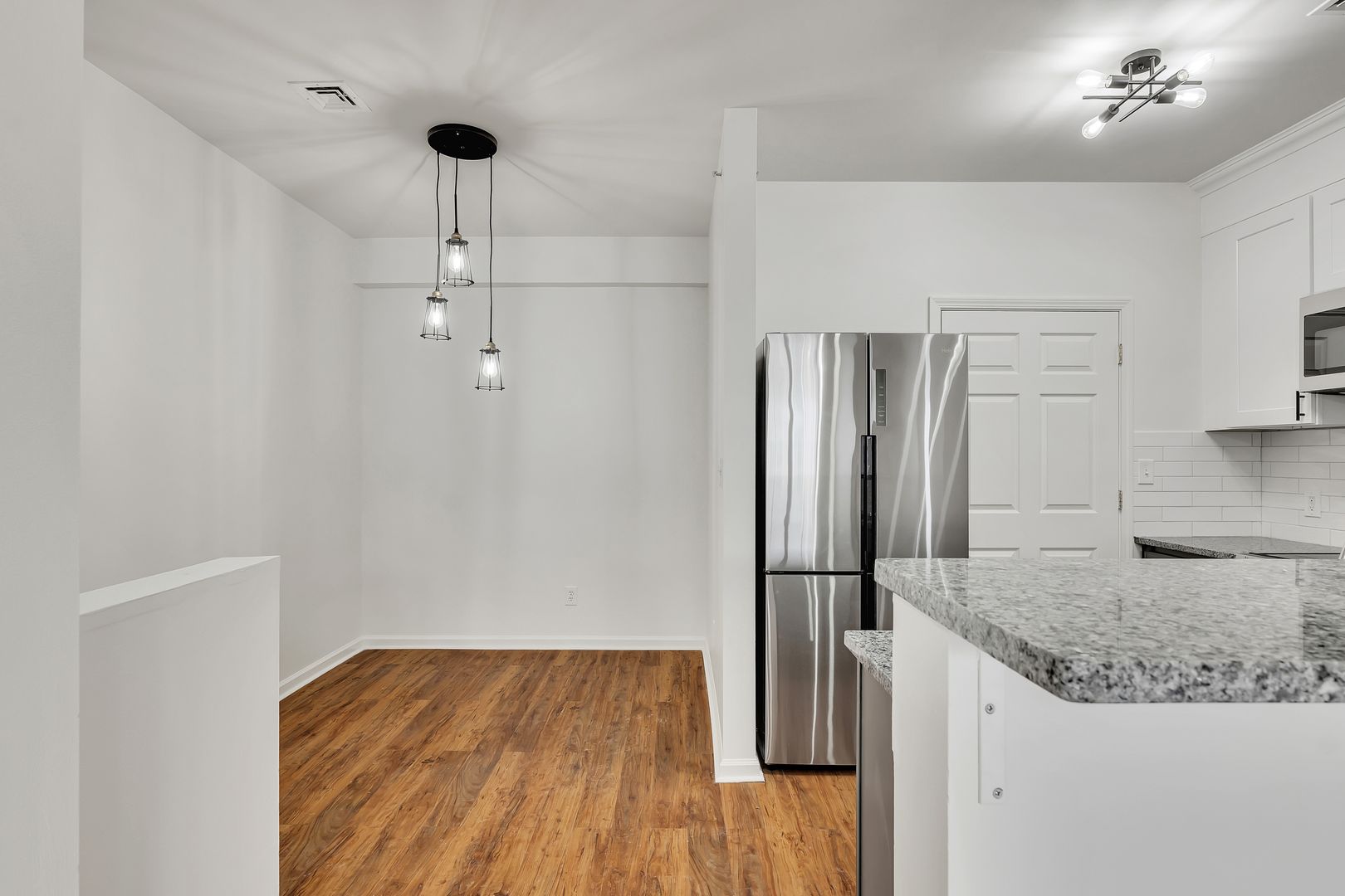 This beautifully updated apartment features an open-concept living and dining area with rich wood-style flooring, recessed lighting, and a modern kitchen highlighted by granite countertops, stainless steel appliances, and stylish pendant lighting. The spacious bedroom offers abundant natural light and clean, neutral finishes, while the bathrooms are thoughtfully renovated with contemporary fixtures, including a sleek walk-in shower and a full tub option. Additional conveniences include in-unit washer and dryer, an attached garage for secure parking and extra storage, and a bright, functional layout designed for comfortable everyday living.