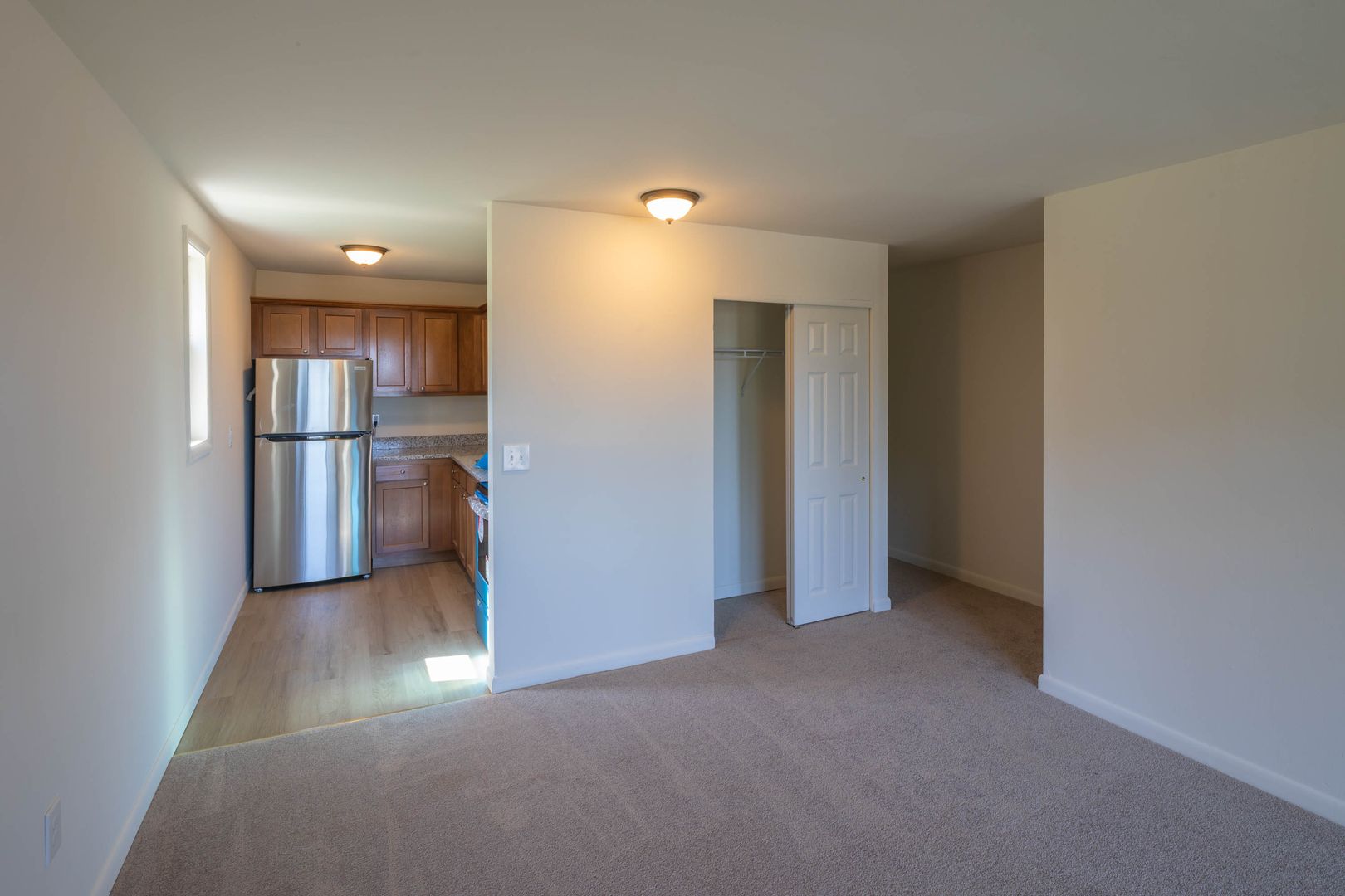 This apartment offers a beautifully updated kitchen with a modern refrigerator, sleek cabinetry, and stylish flooring. Fresh carpeting throughout enhances the comfort and warmth of the living spaces, while a newly renovated bathroom adds a touch of luxury. The entire apartment has been freshly painted, giving it a bright, clean look and making it truly move-in ready