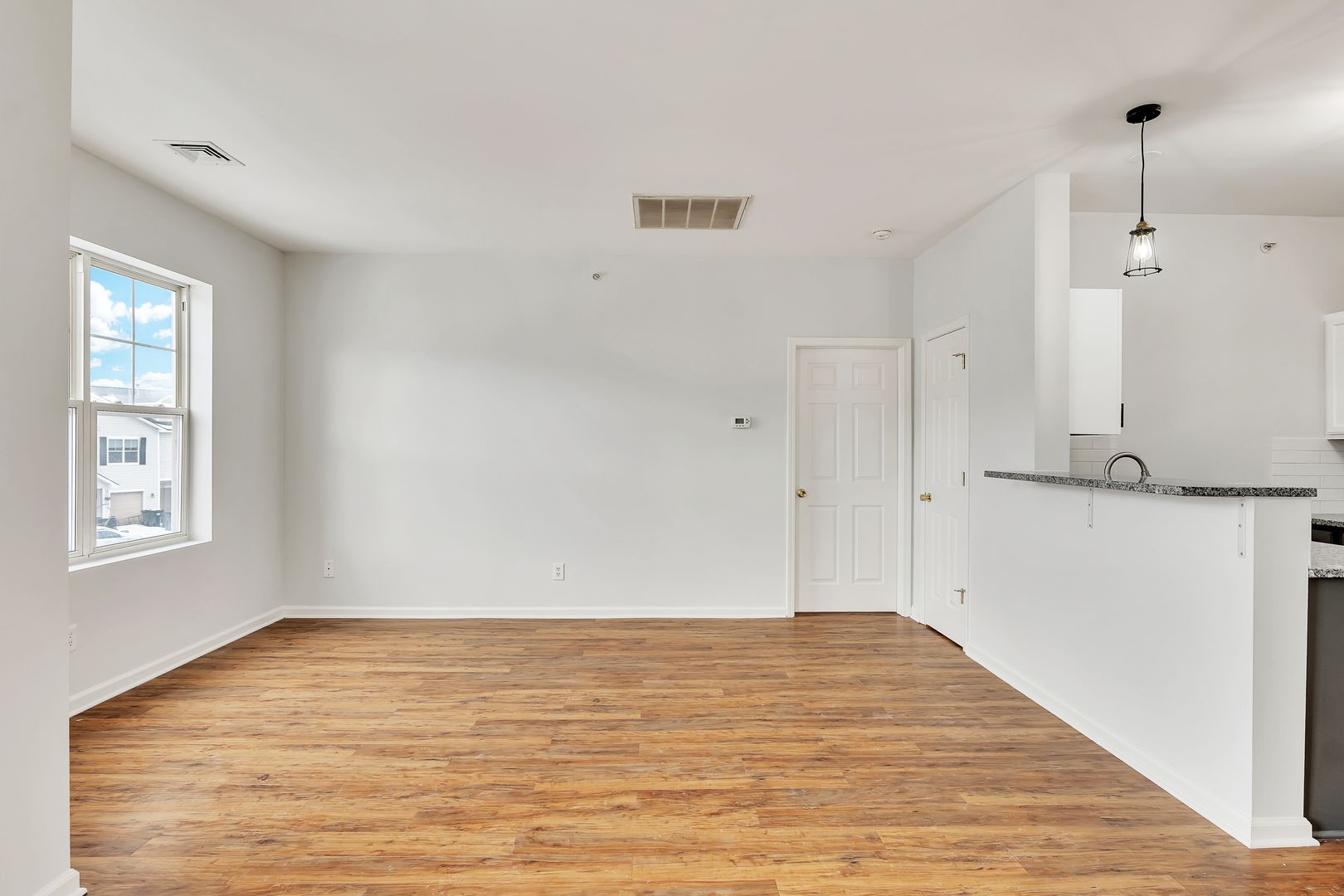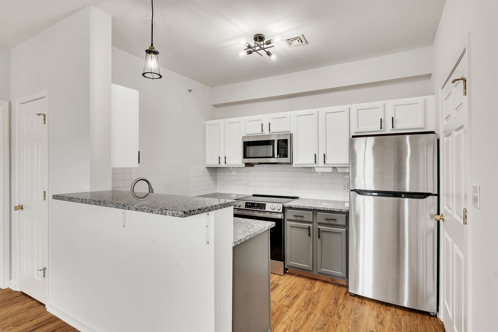 This bright, freshly updated apartment features a clean, modern design with warm wood-style flooring, neutral paint tones, and abundant natural light throughout the open living and dining area. The kitchen offers white shaker-style cabinets, granite countertops, stainless steel appliances, contemporary lighting, and a breakfast bar that opens seamlessly to the living space. The bedroom is generously sized with large windows, while the bathroom includes an updated vanity and a full tub/shower combination. Completing the home is the added convenience of an attached garage, providing secure parking and additional storage in this move-in-ready, low-maintenance apartment.